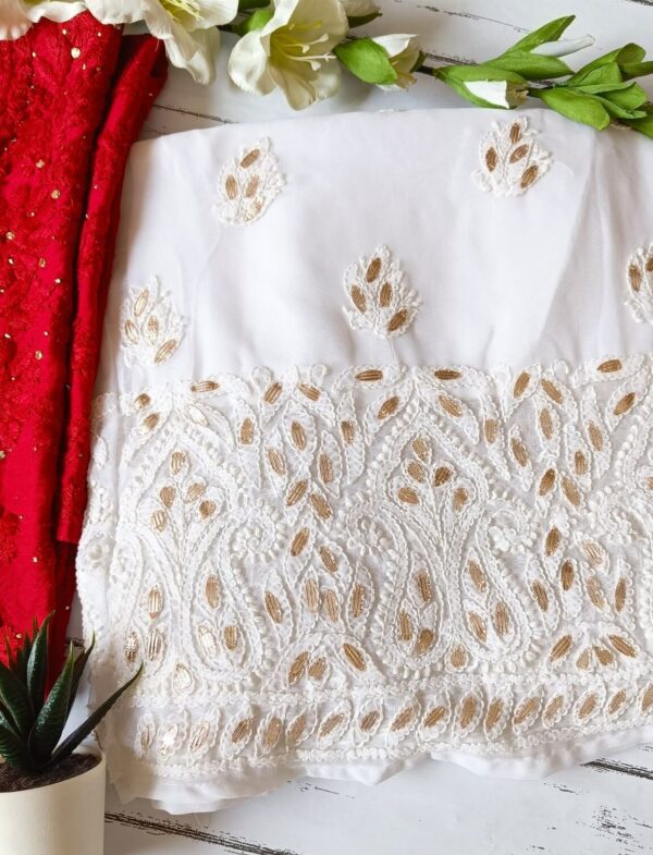 - Kurta – Astounding Ruby Red Chanderi Cotton With Heavy Chikan Embroidery + Mukaish Work (Stitched )