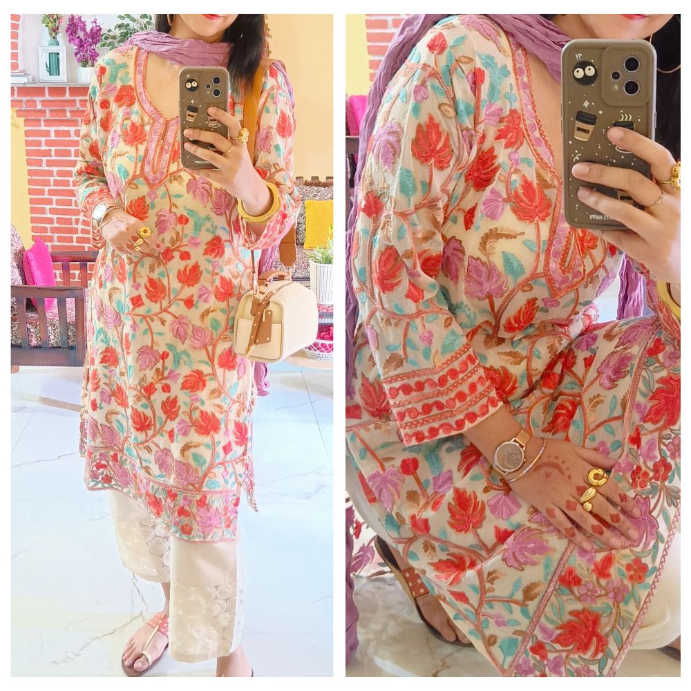 A go-to chiffon kurta set with Kashmiri embroidery , cotton pants and soft dupatta